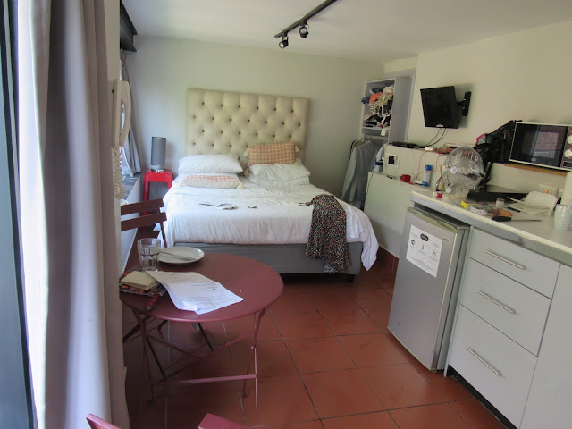 Our place is the bottom flat beyond the wooden steps. This is at the back of the house, the upstairs of which is occupied by the owner of these and several other properties in Cape Town. It is very nice and well appointed but more studio than apartment. Look inside and you will see what I mean.